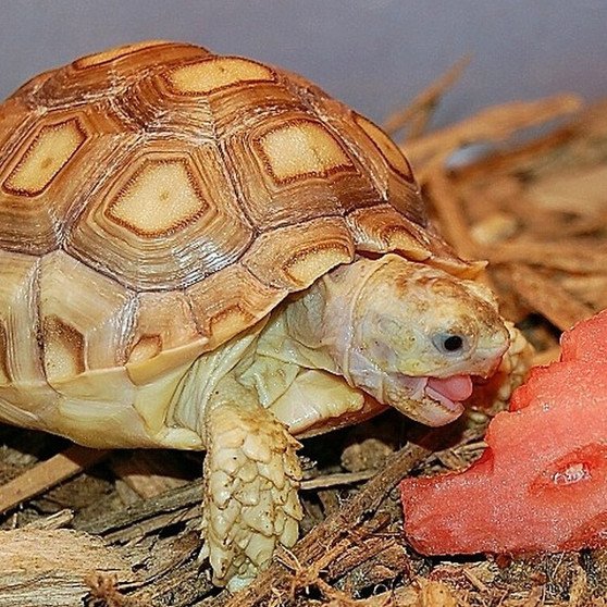 Sulcattas are eating machines and juveniles will graze on grasses, hay, and tortoise pellets mixed with veggies for hours at a time. Adults do well on mostly grasses; and all sizes enjoy dark leafy greens fruits and vegetables in moderation. A calcium supplement is an important part of their diet. Care must be taken to be sure that foods containing protein or too much phosphorus are avoided, and that colorful, non edible items are not with in reach. Sulcattas try to climb, and care must be taken to prevent them from flipping over.