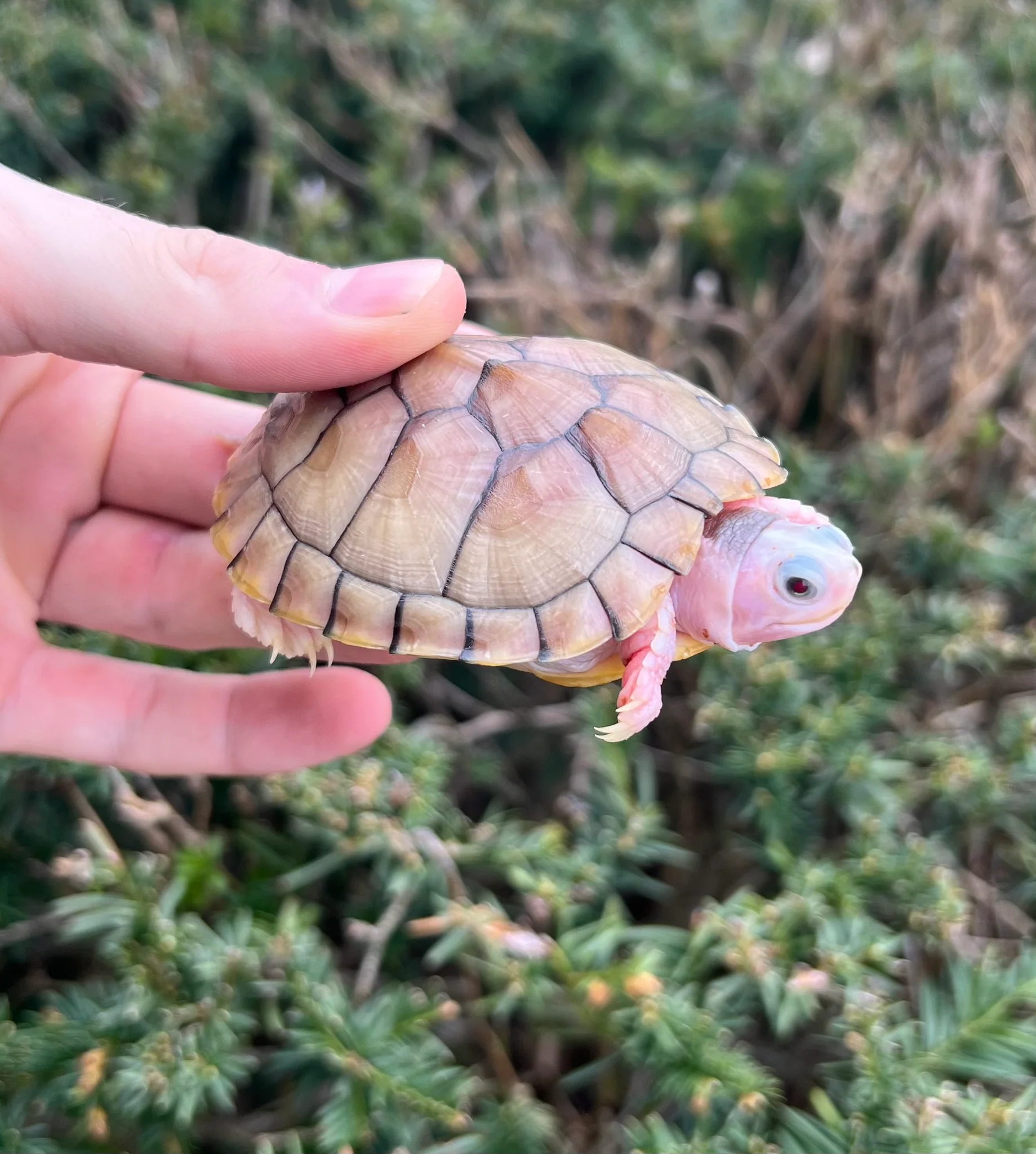 Habitat: Thrives in a water-and-land setup. High-intensity UVB lighting and a dedicated basking platform (reaching 32°C–35°C) are essential to maintain the health of their unique shell pigmentation Pink Albino Red Eared Slider Caramel
