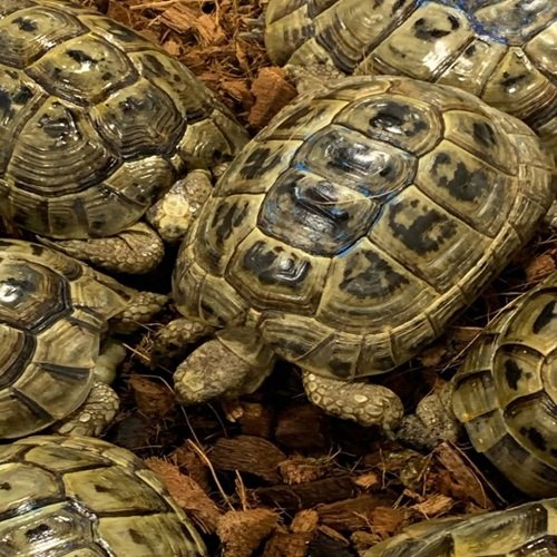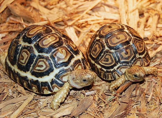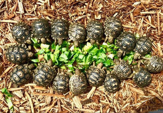 Leopard Tortoises originally came from the savannas of Southern and Eastern Africa. Their importation ended in 2000, so nearly all available animals are captive born here in the US,AU,CA. Breeders have become better at producing them in recent years, and once they are well started, they are great to keep and work with. Inside they do well on mulch or sand, and in tanks or enclosures with temperature ranges from 77 f to 87 f.