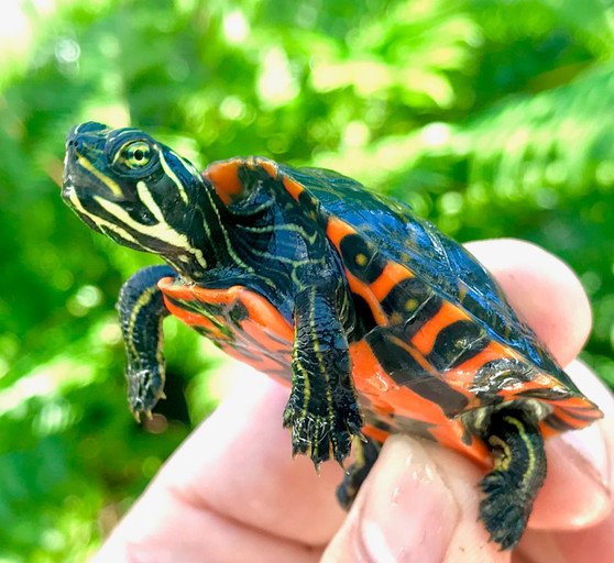 Northern Red Bellys hatch out with brilliant colors. They make very good starter and community tank turtles. They are very active, and love to bask. Juveniles are omnivorous, they love pellets, romaine lettuce,some fish, water plants and dark leafy greens, as adults are mostly herbivores. Juveniles have brilliant green shells and bright orange & red and yellow bellies. As they age their carpaces (top shells) become a darker green while their bellies stay brightly colored with lots of color variation. Once 4 – 5 inches they make nice additions to outdoor ponds in both mild and colder states. A fine turtle for keepers of any level.