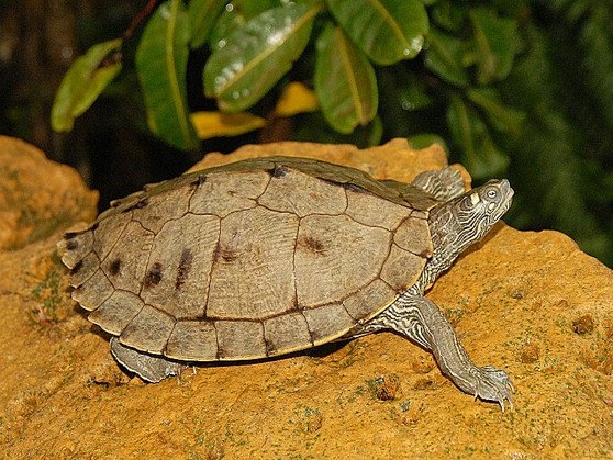 One of the small headed Map Turtles, the Ouachita Map Turtle is found in swift rivers and silt bottomed lakes from Texas and Louisiana north to Ohio and east to Kentucky. Ouachita Maps love to bask, and often pile several turtles high to share the same basking log. With colors from ranging from light gray to deep brown, this very pretty map turtle has many color variations.