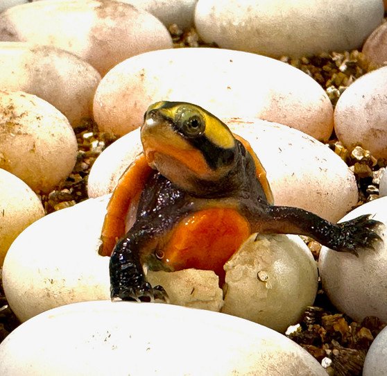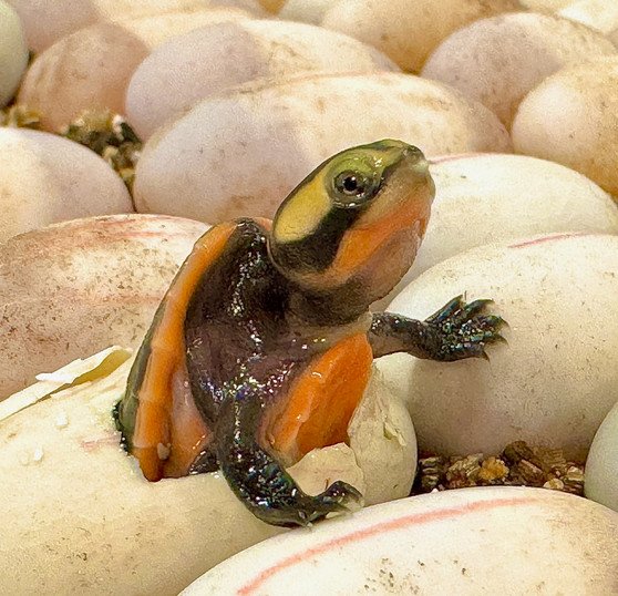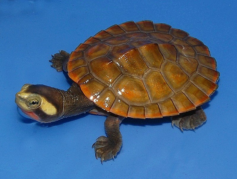 Pink Bellied Side-Necks are mostly carnivors, and will eat pellets, fish and meat. Water temperatures that stay above 65 degrees Fahrenheit (76F – 83F is ideal) will keep this species happy, and keepers will enjoy a very colorful and active representative of New Guinea and Australian lakes and rivers.