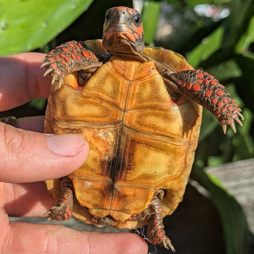 Red-footed Tortoises do very well in community settings. With a little extra care, hatchlings thrive with other tortoises. Shallow, warm water soaking every third day, a warm basking spot and plenty of food is the key for these pretty starter tortoises.